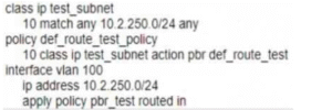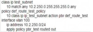 You are configuring Policy Based Routing (PBR) for a subnet that will be used to test a new default route for your network Traffic originating from 10.2.250.0/24 should use a new default route to 10.1.1.253. Other non-default routes for this subnet should not be affected by this change. What are two parts of the solution for these requirements? (Select two.) A)