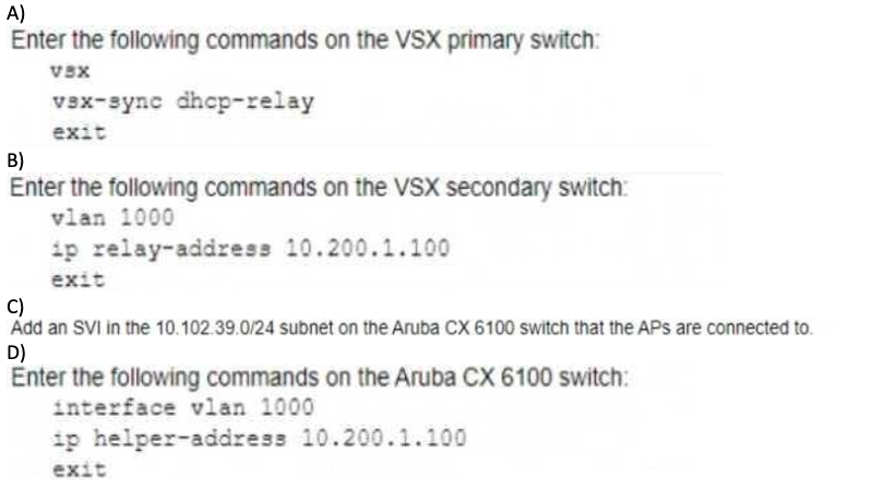 You are troubleshooting an issue with a 10 102.39 0/24 subnet which is also VLAN 1000 used Tor wireless clients on a pair of Aruba CX 8360 switches The subnet SVI is configured on the 8360 pair, and the DHCP server is a Microsoft Windows Server 2022 Standard with an IP address of 10.200.1.100. The 10.102.250.0/24 subnet is used for switch management. A large number of DHCP requests are failing You are observing sporadic DHCP behavior across clients attached to the CX 6100 switch. Which action may help fix the issue?